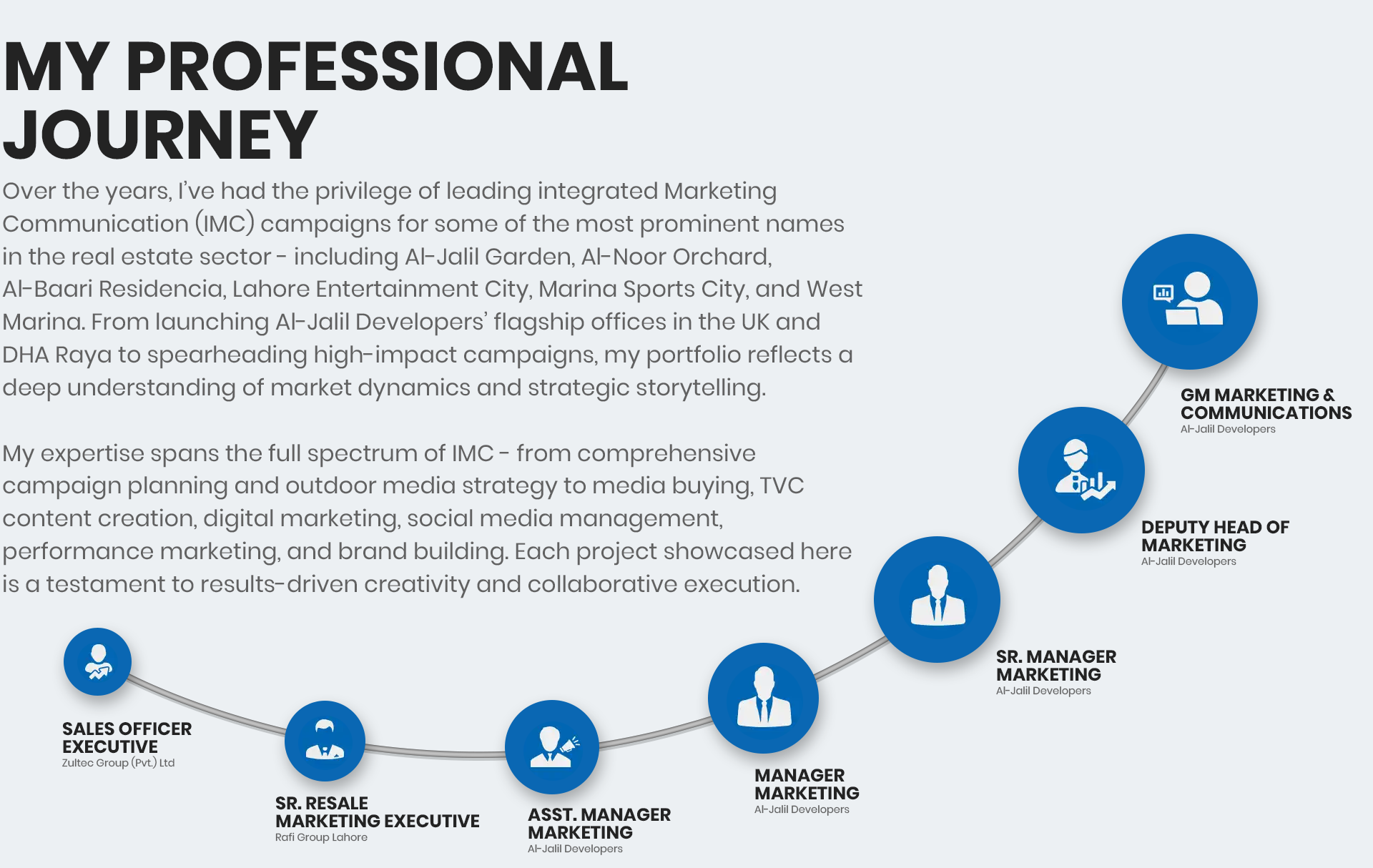 Over the years, I’ve had the privilege of leading Integrated Marketing Communication (IMC) campaigns for some of the most prominent names in the real estate sector — including Al-Jalil Garden, Al-Noor Orchard, Al-Baari Residencia, Lahore Entertainment City, Marina Sports City, and West Marina. From launching Al-Jalil Developers’ flagship offices in the UK and DHA Raya to spearheading high-impact campaigns, my portfolio reflects a deep understanding of market dynamics and strategic storytelling. My expertise spans the full spectrum of IMC — from comprehensive campaign planning and outdoor media strategy to media buying, TVC content creation, digital marketing, social media management, performance marketing, and brand building. Each project showcased here is a testament to results-driven creativity and collaborative execution.